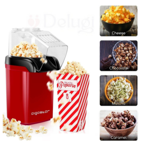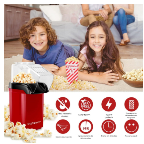 A melhor pipoqueira elétrica é ideal para quem busca rapidez e praticidade no preparo da sua pipoca. Com capacidade para 100g de milho por preparo, ela faz pipoca em menos de 3 minutos e acompanha um compartimento para como dosador de milhos ou armazenamento de manteiga para derretimento da mesma para pós preparo de sua deliciosa pipoca, despejar a manteiga derretida e se deliciar. Utilizando tecnologia de circulação de ar quente, é bom que elimina a necessidade de adição de óleo ou gordura durante o preparo ( utilizar sem oleo ). Como Utilizar a PIPOQUEIRA ELÉRICA: Fácil e rápido, conecte a tomada elétrica, coloque o milho no recipiente prateado interno, coloque a parte superior da pipoqueira e liga no botão Liga/Desl. Em até 3 minutos sua deliciosa Pipoca estará pronta. Simples, prático e rápido.Características: - Pipoca pronta em até 3 minutos;- Tecnologia de circulação de ar quente;- Bocal direcionador para as pipocas;- Colher dosadora que também serve para derreter manteiga;- Sistema de proteção contra superaquecimento;- Design compacto;Ficha técnica: - Altura: 30 cm- Largura: 15 cm- Comprimento: 20 cm- Peso: 0,850kg - Voltagem: 110V - Potência: 1200W - Cor: Preto e vermelho Contém: - 01 Pipoqueira elétrica;- 01 Recipiente para derretimento de manteiga, chocolate- 01 Manual de instruções. Perguntas frequentes: Da pra fazer pipoca gourmet? Olá, seja bem-vinda. Sim. Boa tarde, ela vem com balde? Olá seja muito bem-vinda. Ela não acompanha balde, porém s senhora pode utilizar balde de sua preferência. Aproveita a oferta Ela Frita sem óleo? Sim, não deve ser utilizado óleo para a produção da pipoca da senhora. Conte conosco,