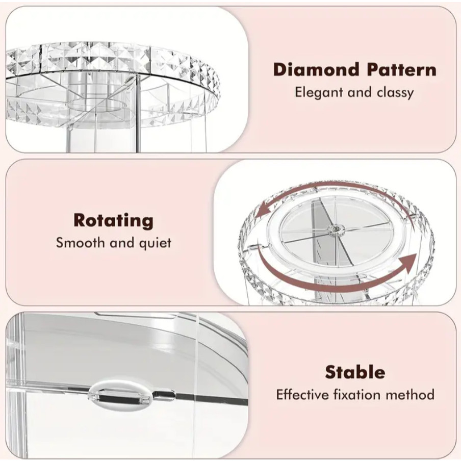 O ORGANIZADOR DE MAQUIAGEM ACRÍLICO 360° FOI DESENVOLVIDO COM ALTO PADÃO DE QUALIDADE, VISANDO GARANTIR PRATICIDADE E ORGANIZAÇÃO DE TODOS OS COSMÉTICOS E INTENS DE MAQUIAGEM PARA SALOÊS, CASAS ETC. O PRODUTO APRESENTE DESIGN MODERNO, DUAS GAVETAS E BANDEJAS COM VARIÁS DIVISÓRIAS PARA ACOMODAR RÍMEL, BATONS, LÁPIS DE OLHOE TAMBEM PODE SER ULTILIZADO COMO PORTA JOIAS, PORTA COSMÉTICOS, PERFUMES, E OQUE MAIS VOCÊ IMAGINAR.